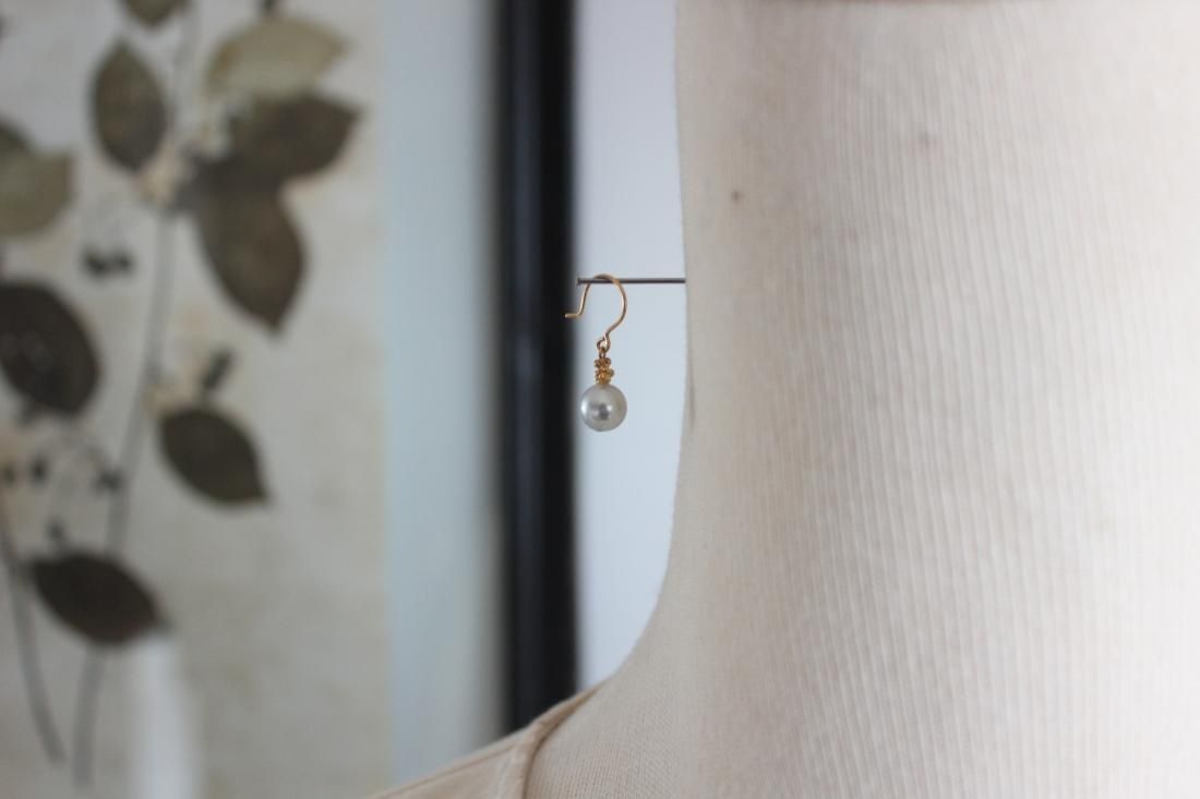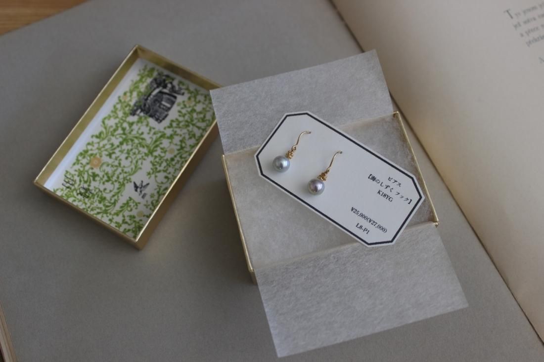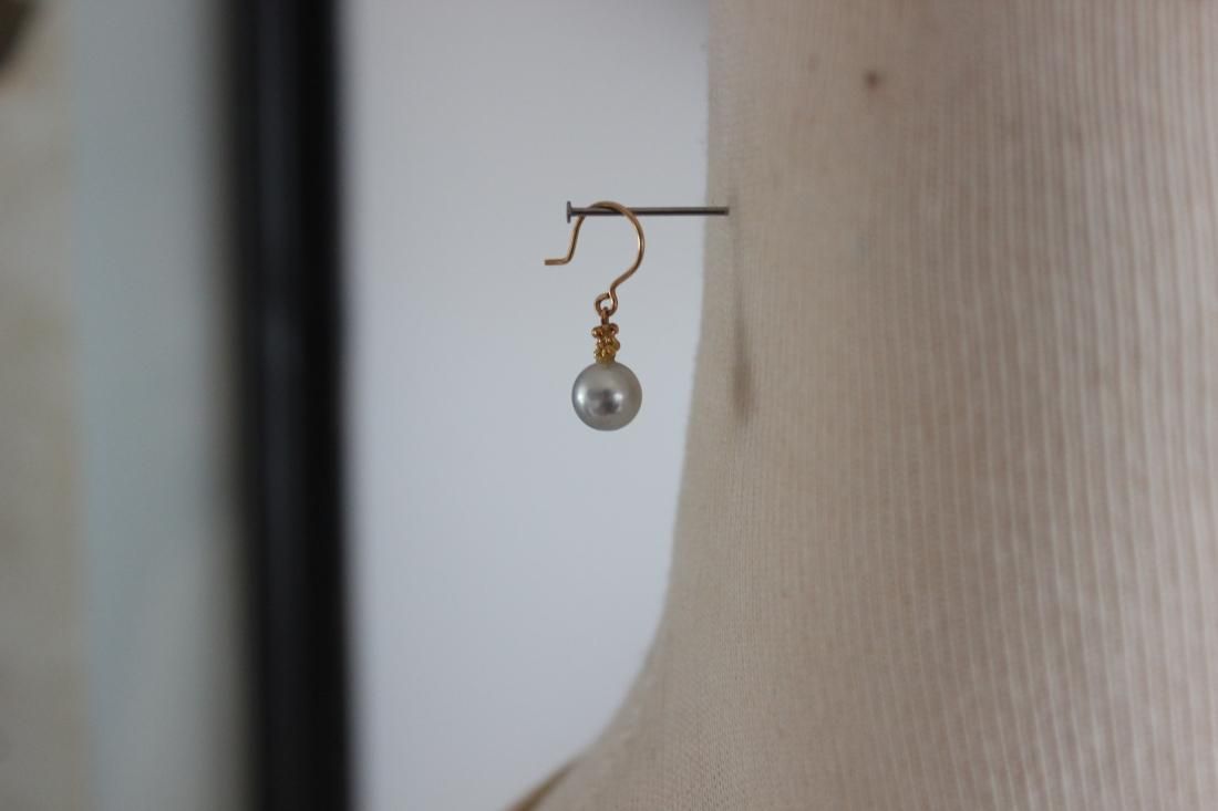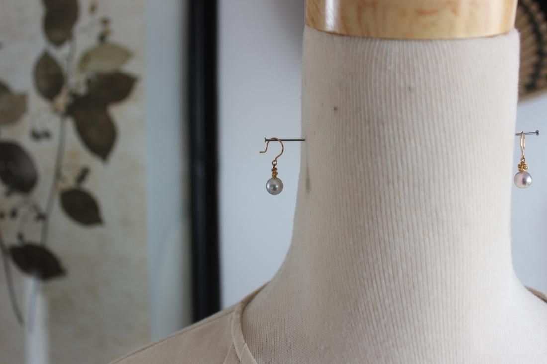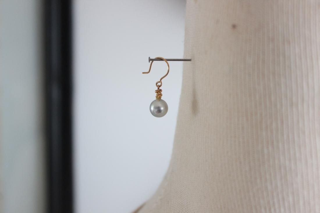 海の泡をイメージした小さな金の粒をあしらった作品。パールは宇和島産の本真珠です。