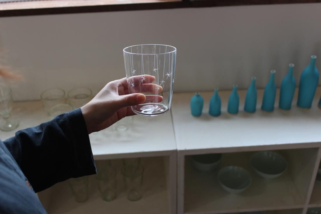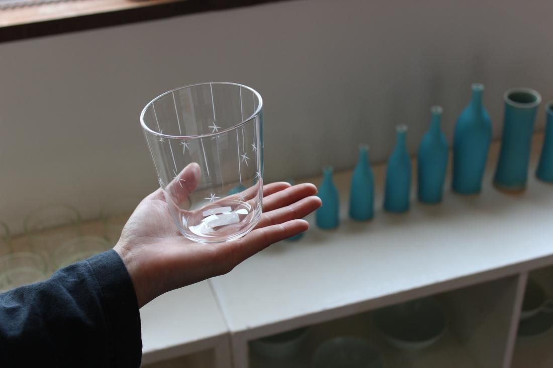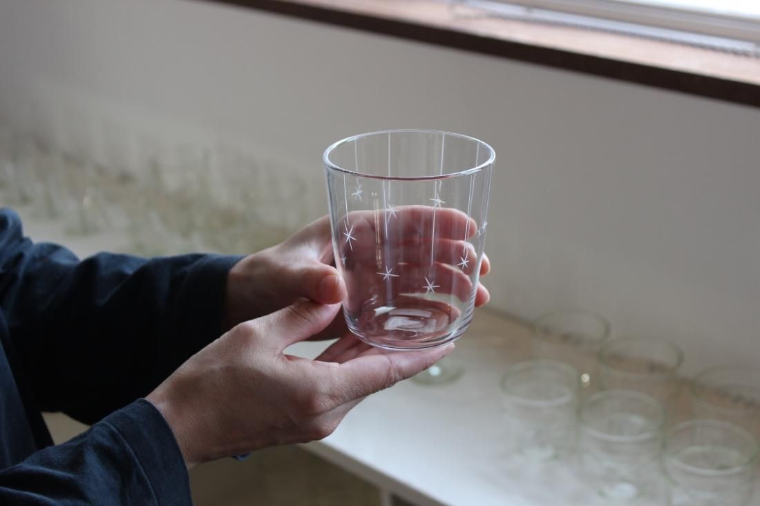 クリアなガラスに伝統的な技法を用いてオリジナルの模様が描かれています。輝く星が降り注ぐ、その名も素敵な 星降るグラス。