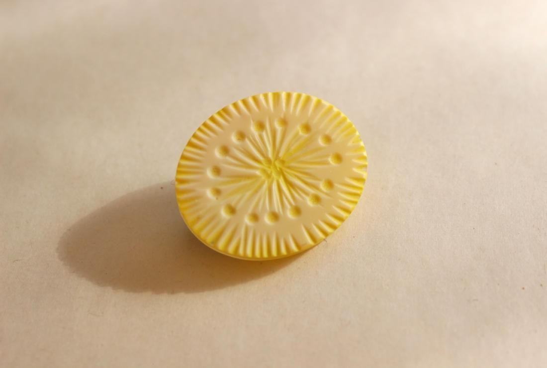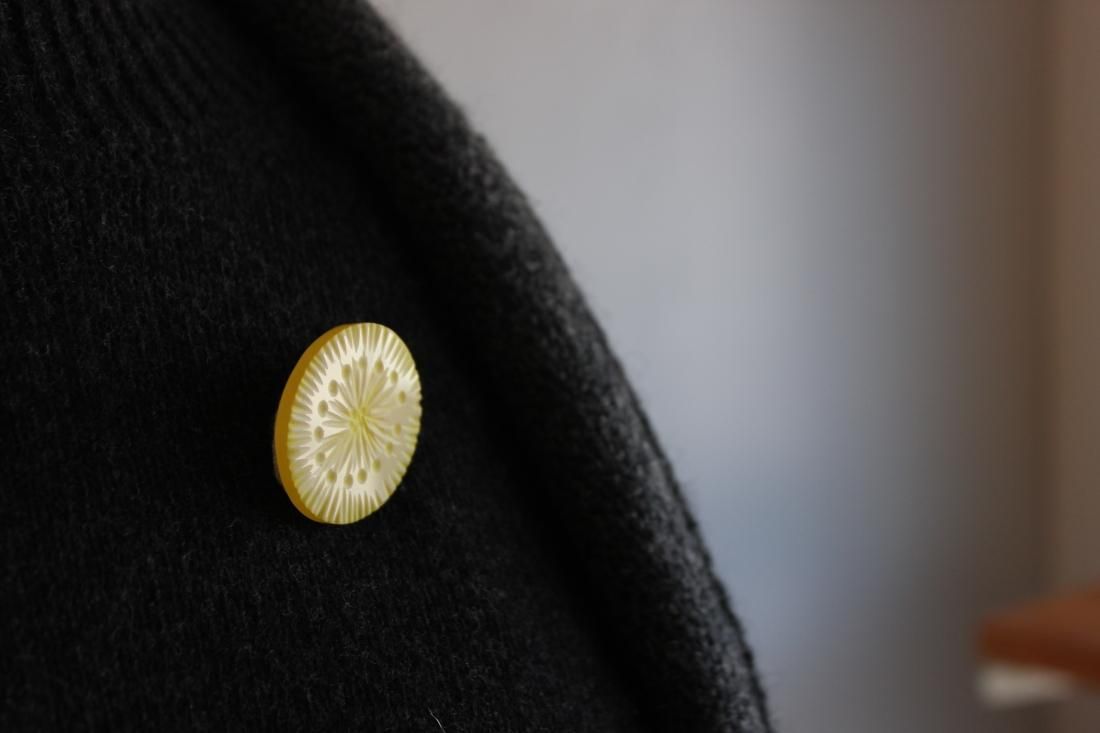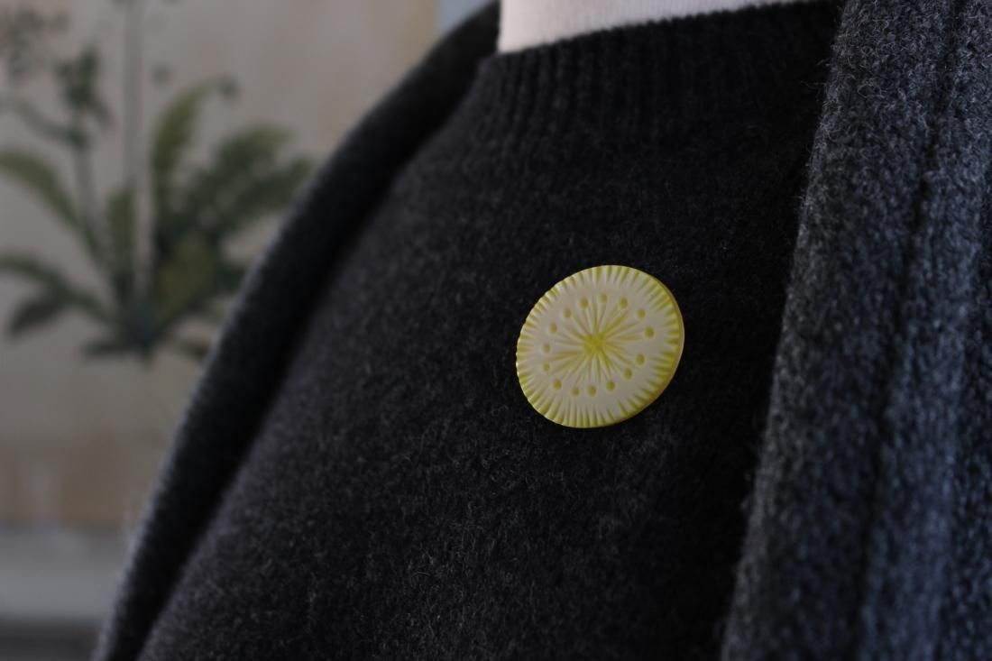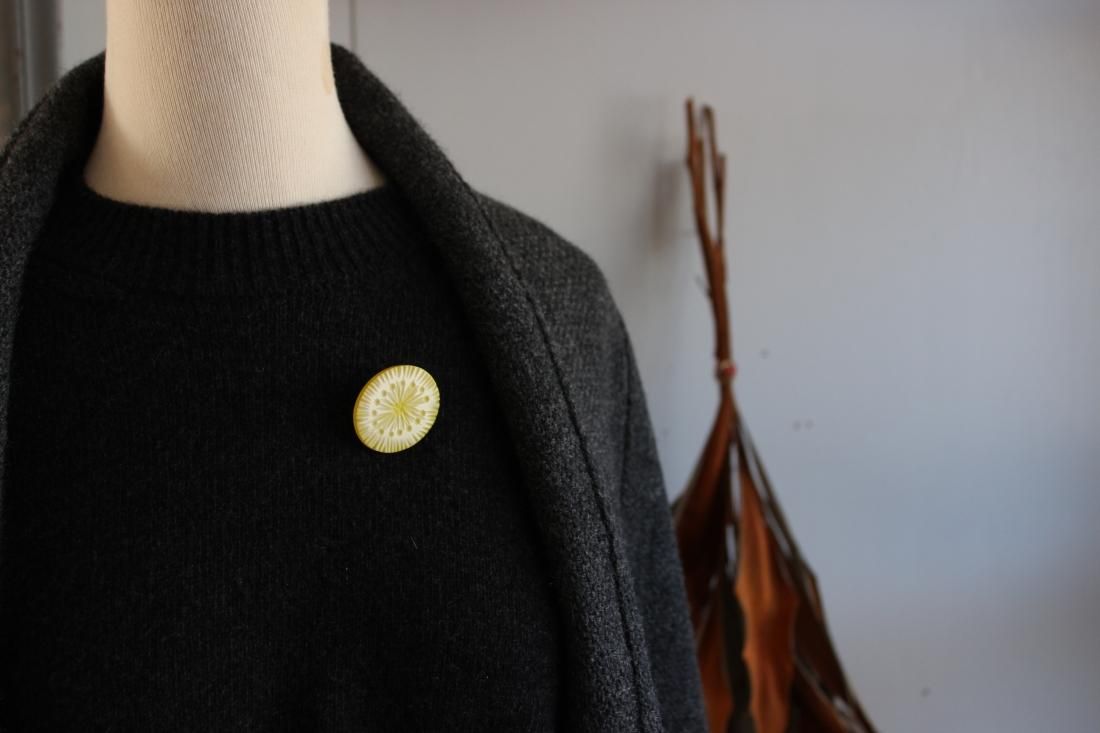 アイボリーの向こうにちらりと見えるイエローがたまらなく愛らしい。ガラスとは想えないほど、あたたかな柔らかな印象です。ガラスの豊かな表情に作り手の世界観が封じ込められたアートなブローチです。