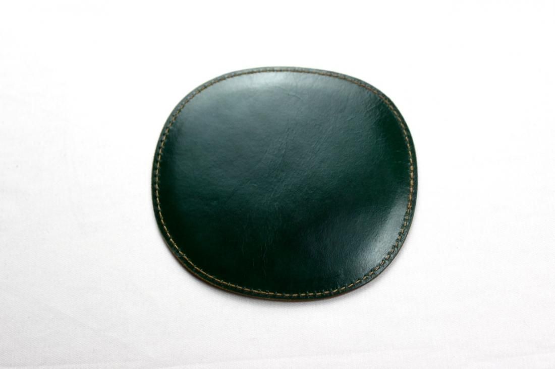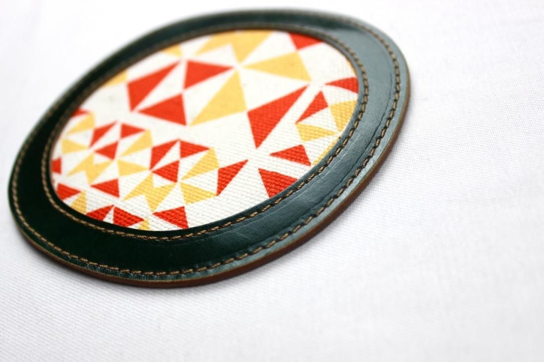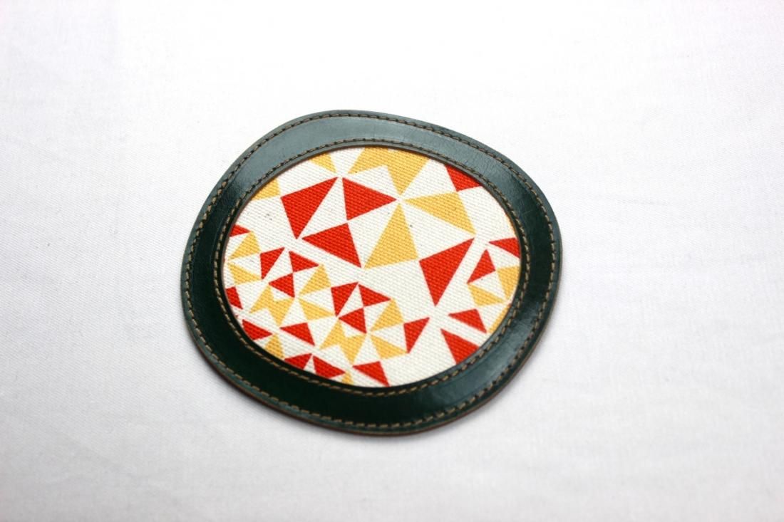 しっかりとした革のコースター。内は厚みのある生地、柄と革の色合わせも素敵です。