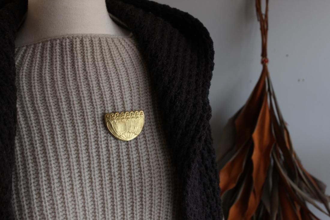 いつか見た外国の絵本の挿絵のような、ほっこりするモチーフ。レトロな雰囲気の傘のような、ロマンティックな花のような、温かな気持ちを誘い出してくれるブローチです。