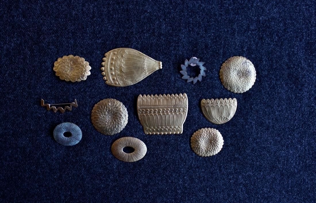 真鍮板を切り出し、先端の仕様が様々な鏨(たがね)を使い分けて、繊細な模様を打ち出されています。