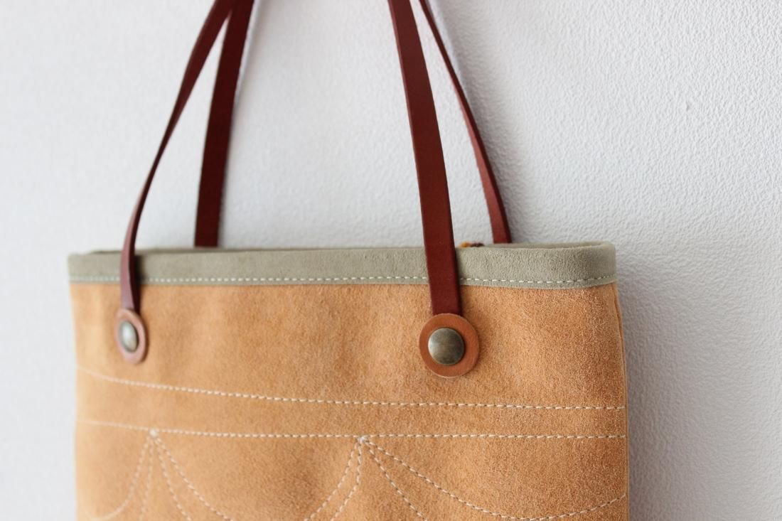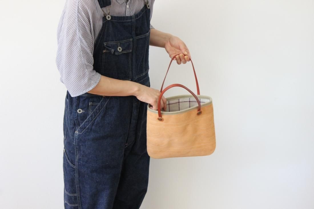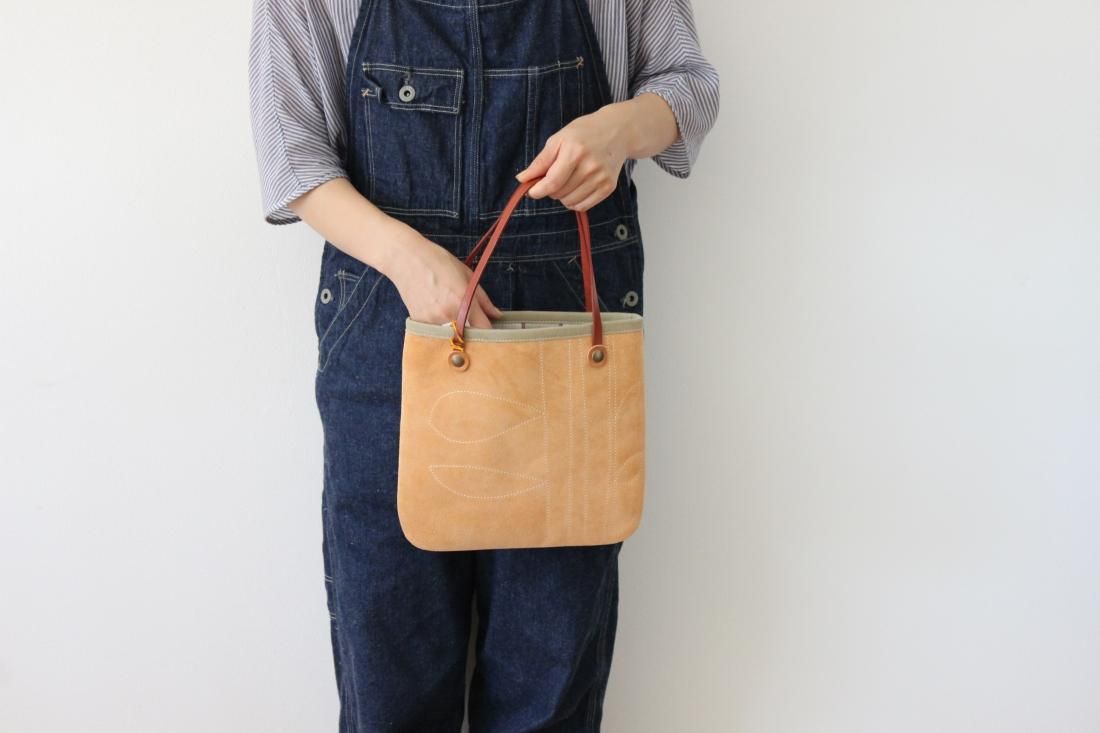 かるいお出かけにちょうどいい大きさのマチのない革のトートバッグです。