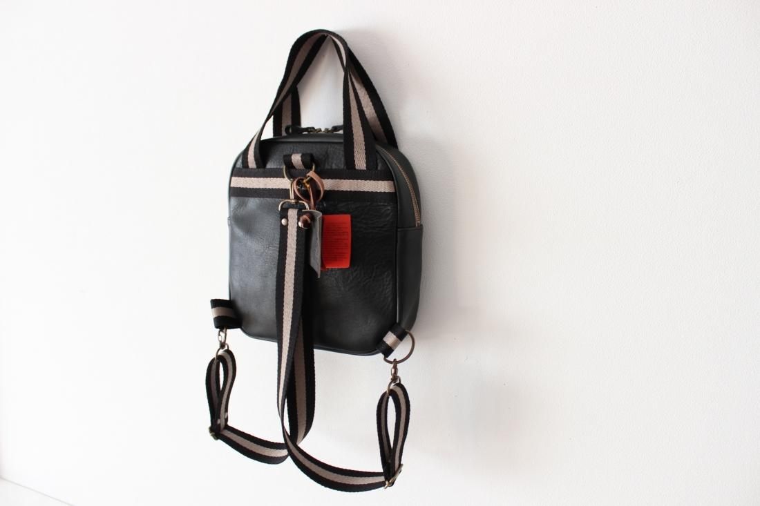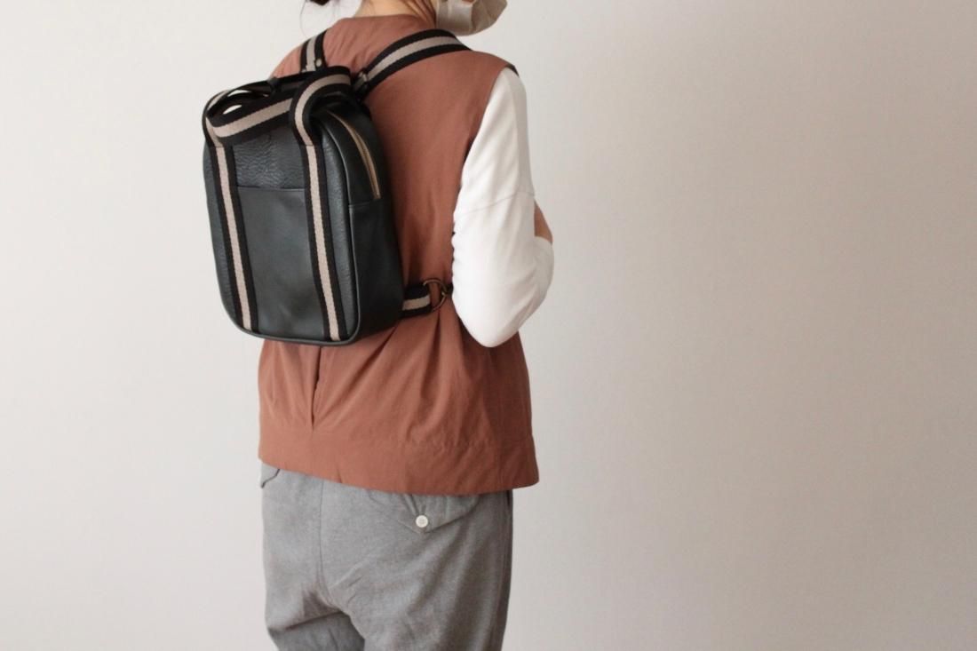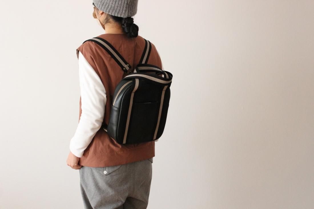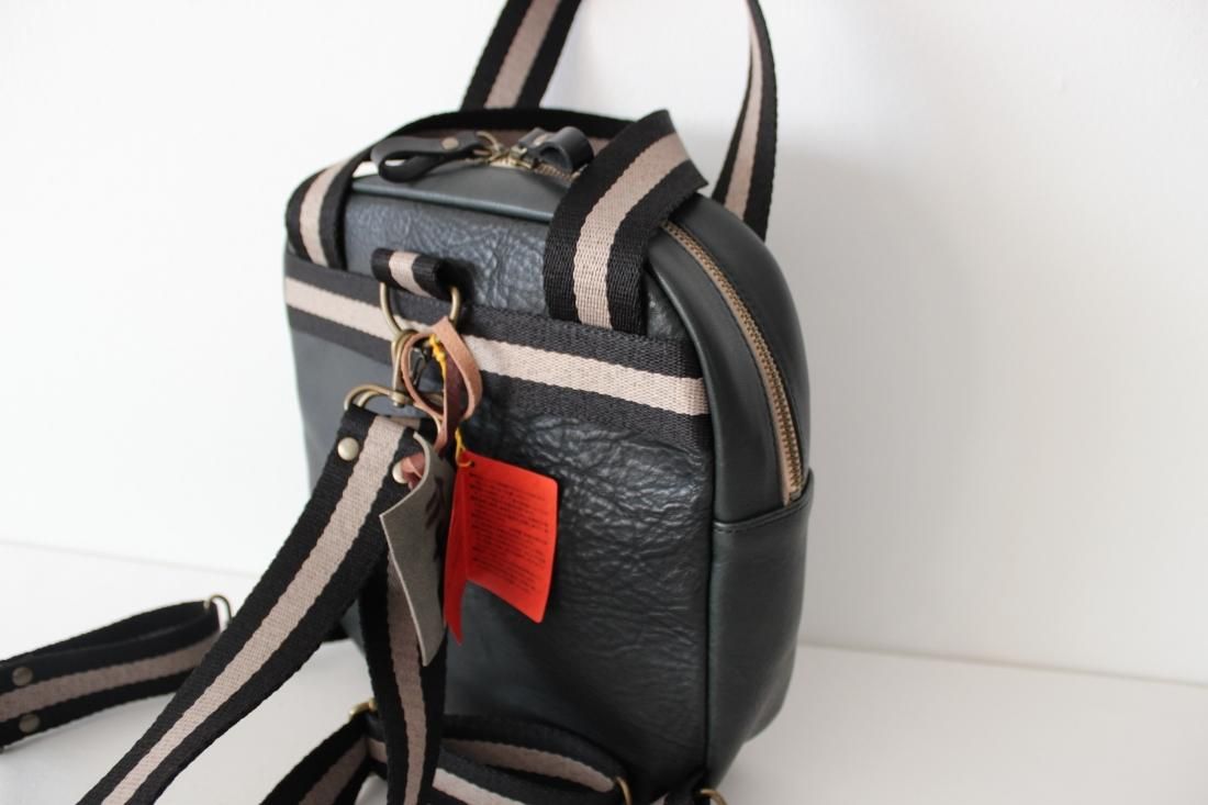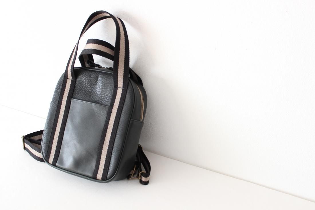 深い紺色の牛革を使用した コロンと丸みのある本体に モノトーン調ストライプのショルダーストラップが効いたリュックサック。
