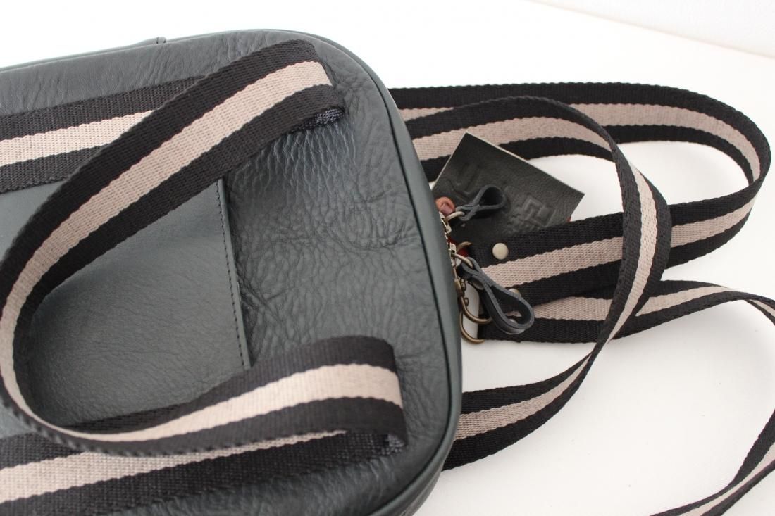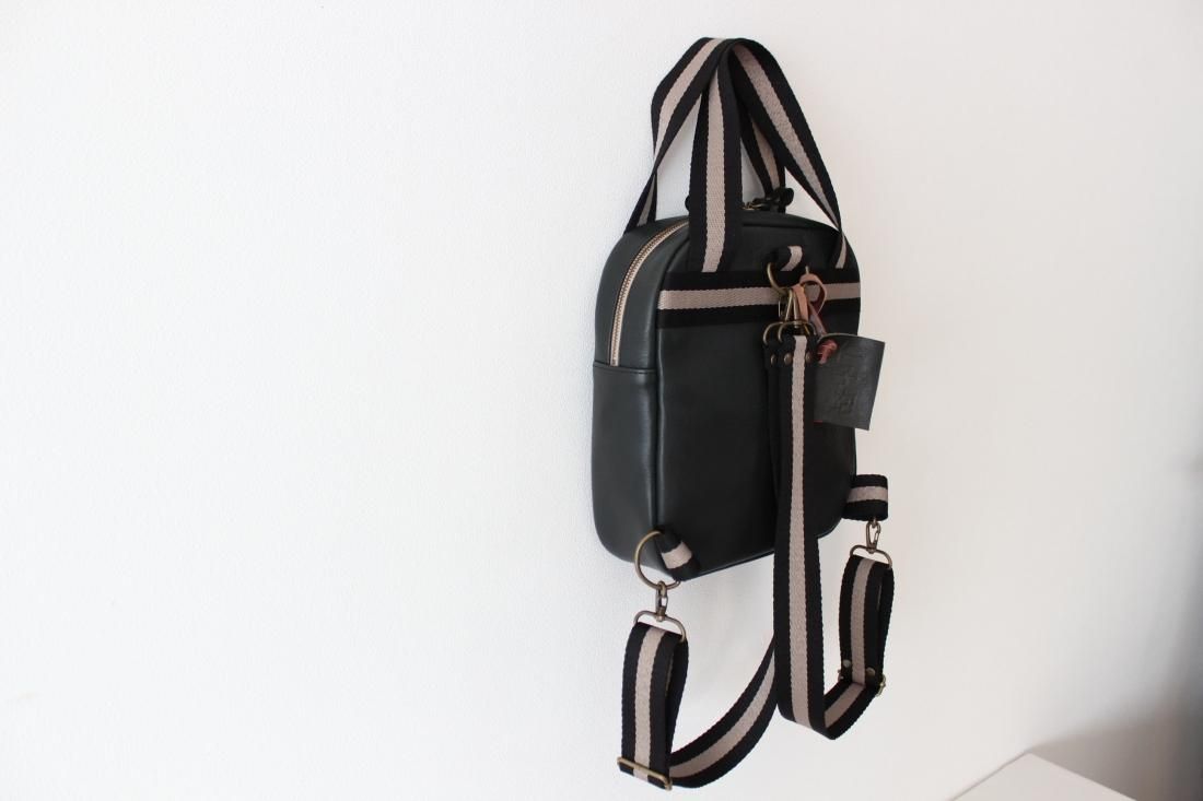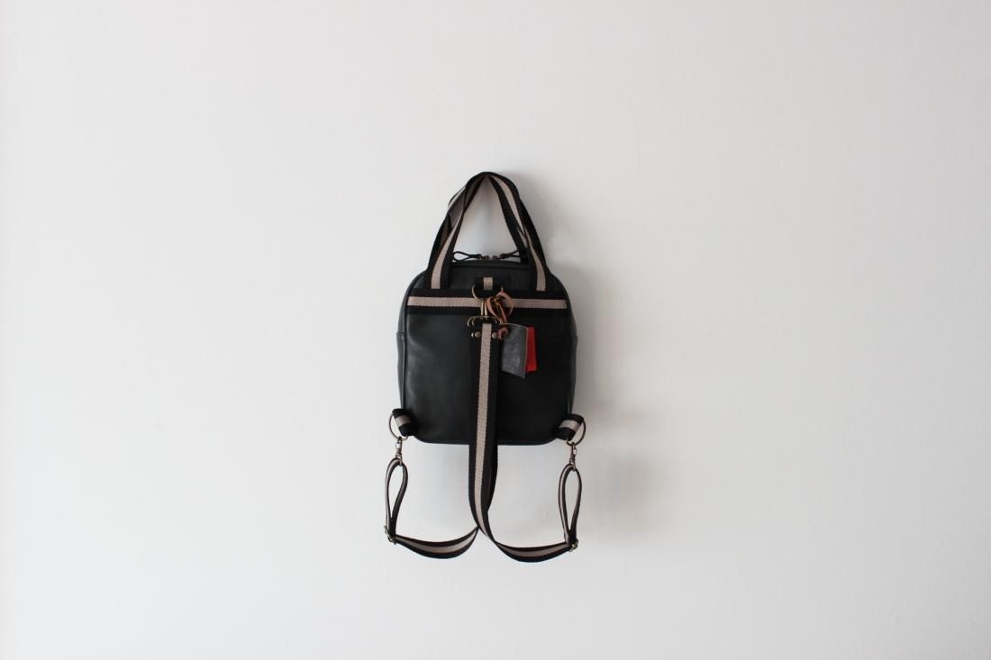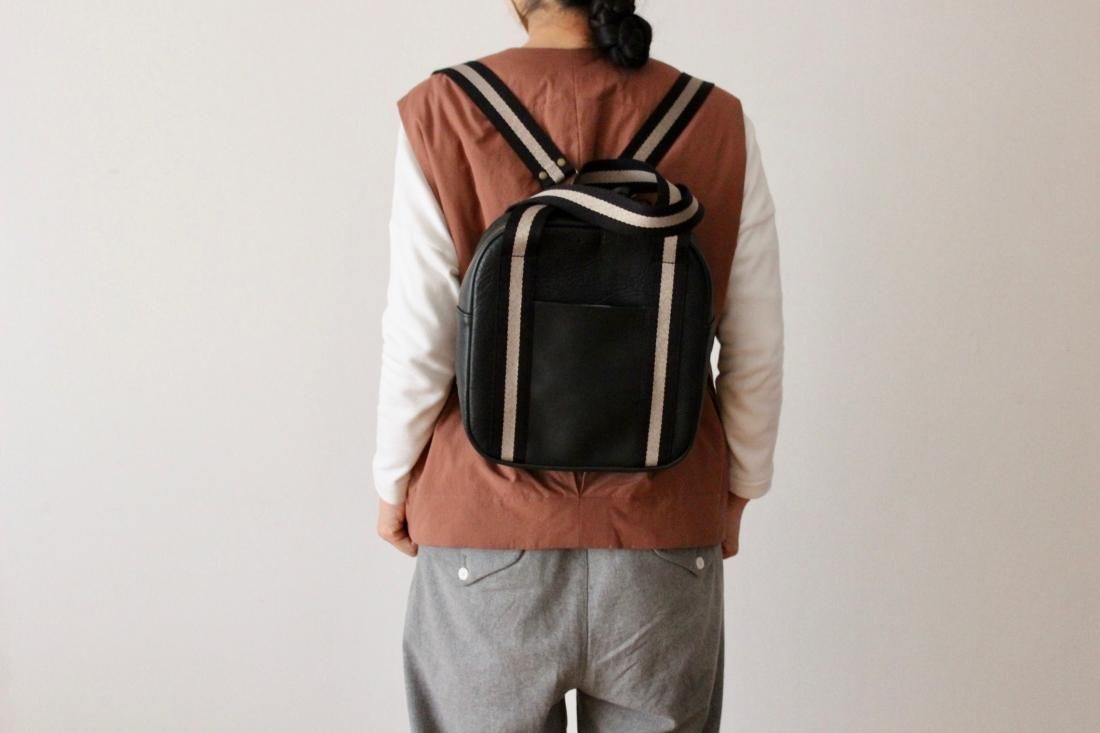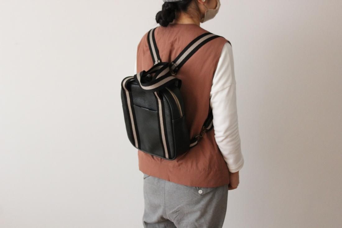 深い紺色の牛革を使用した コロンと丸みのある本体に モノトーン調ストライプのショルダーストラップが効いたリュックサック。