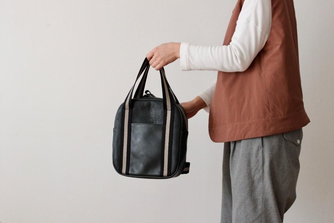 スクエア革リュック紺 2WAY布ベルト / 仁子鞄