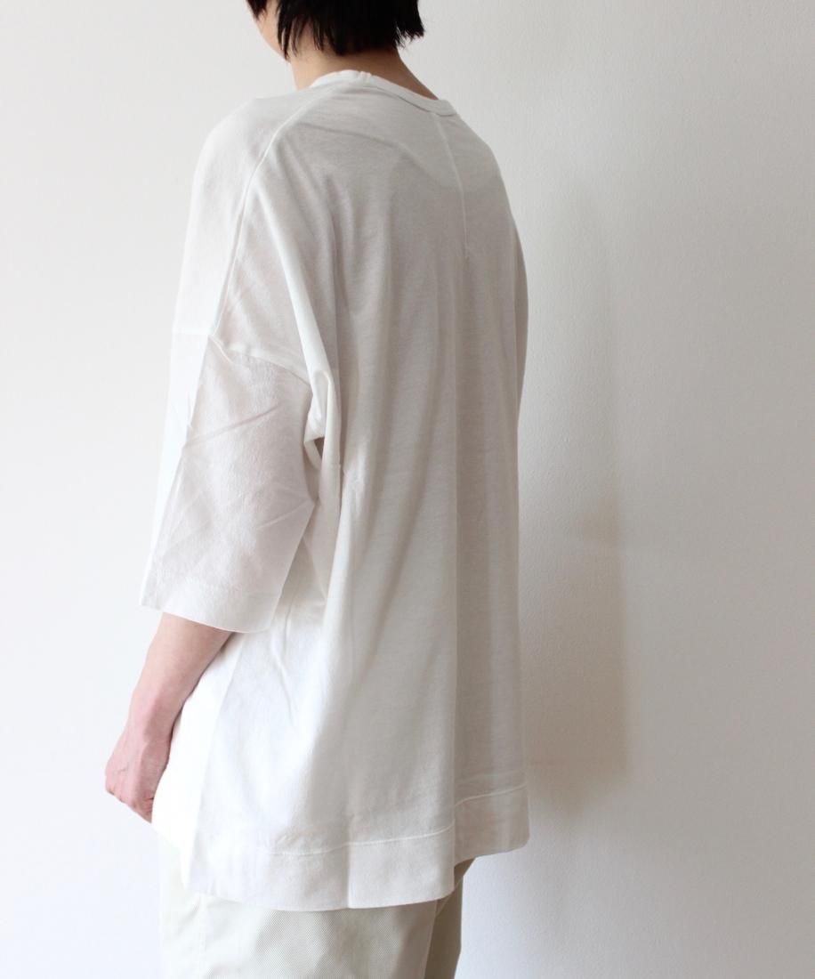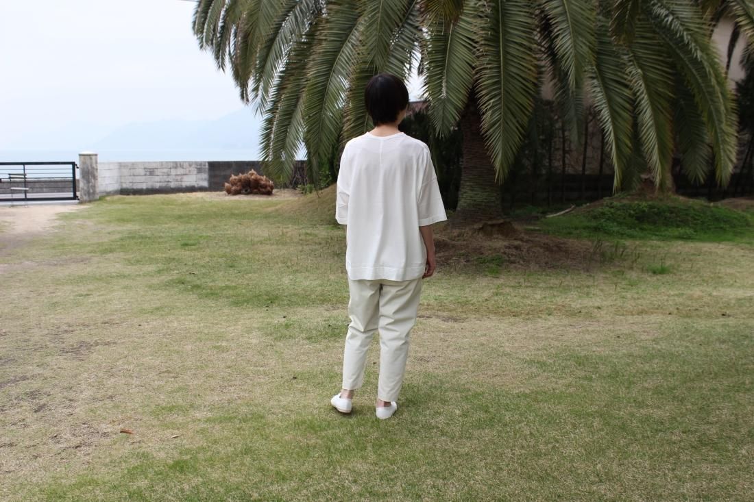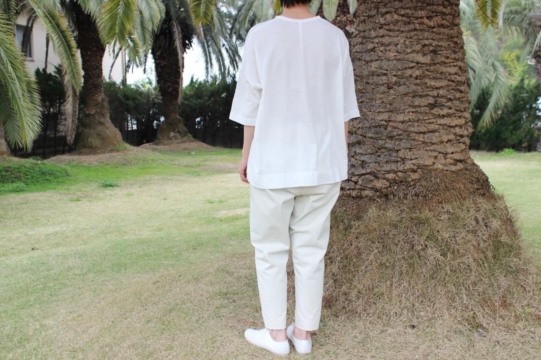 ホワイトはやや透け感がありますが、スッキリとしたシルエットは重ね着にも重宝するため、一年中着用いただけます。