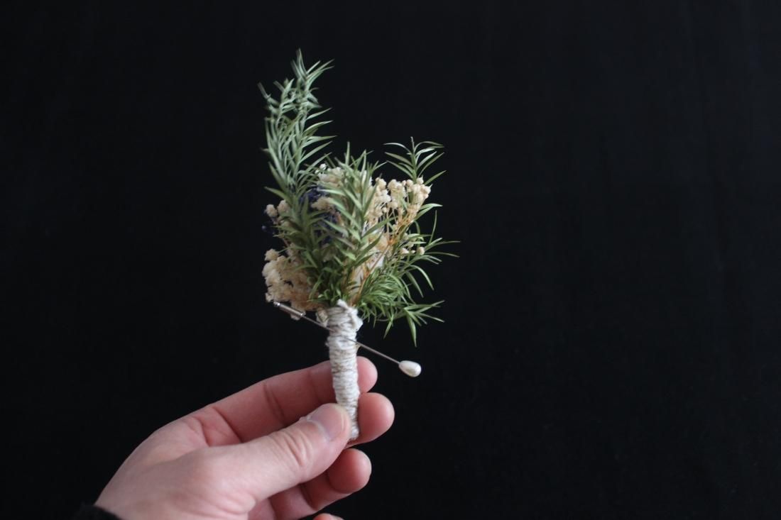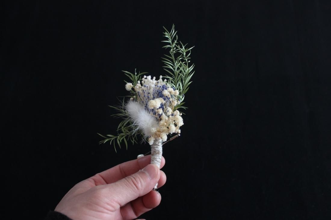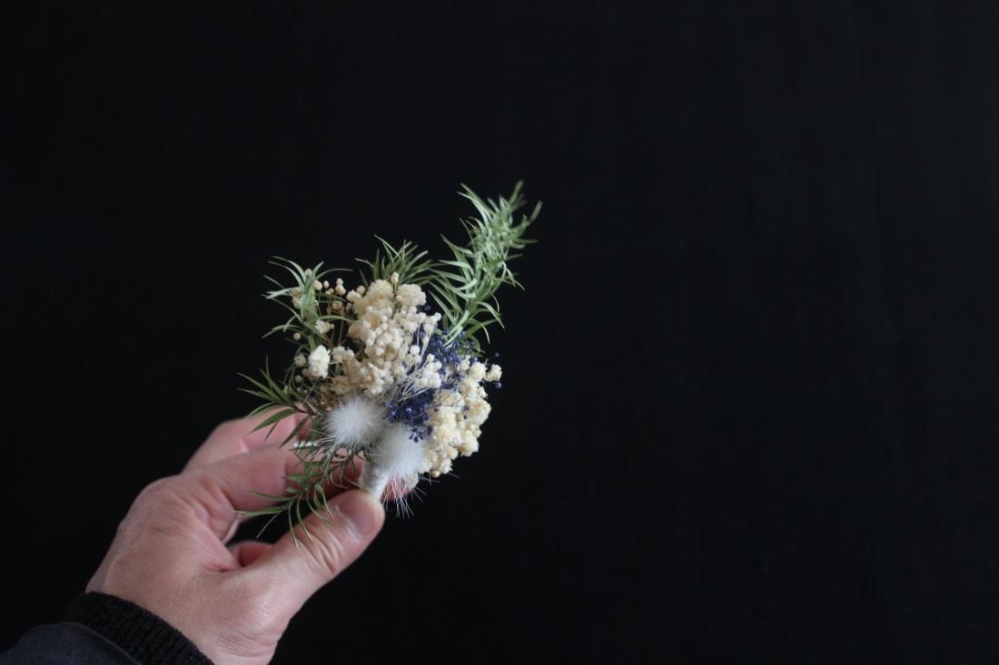 手のひらにおさまる大きさのコサージュです。プリザーブドフラワーでつくられた小さなブーケ、シックな色合いに大人の品を感じます。