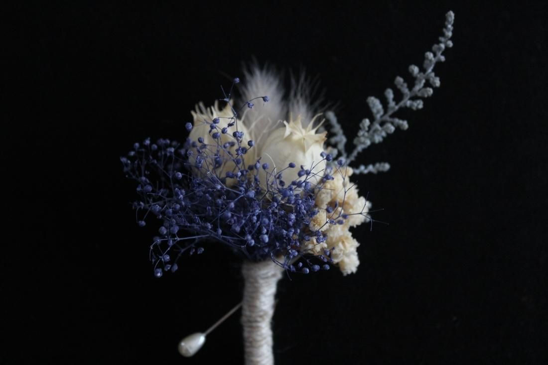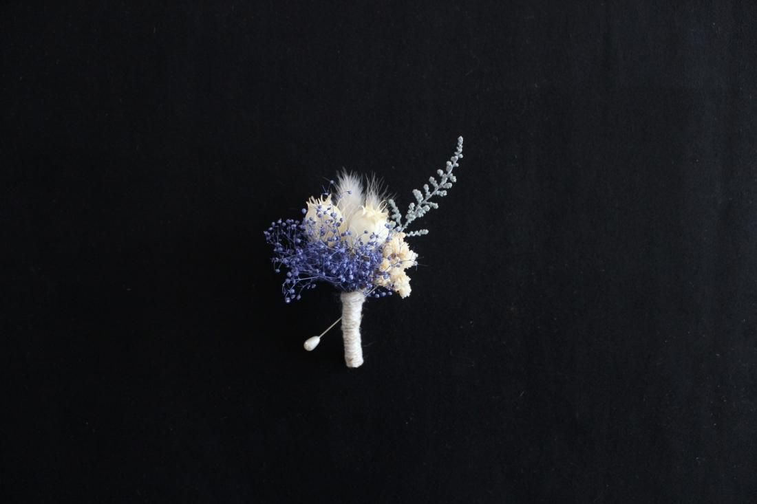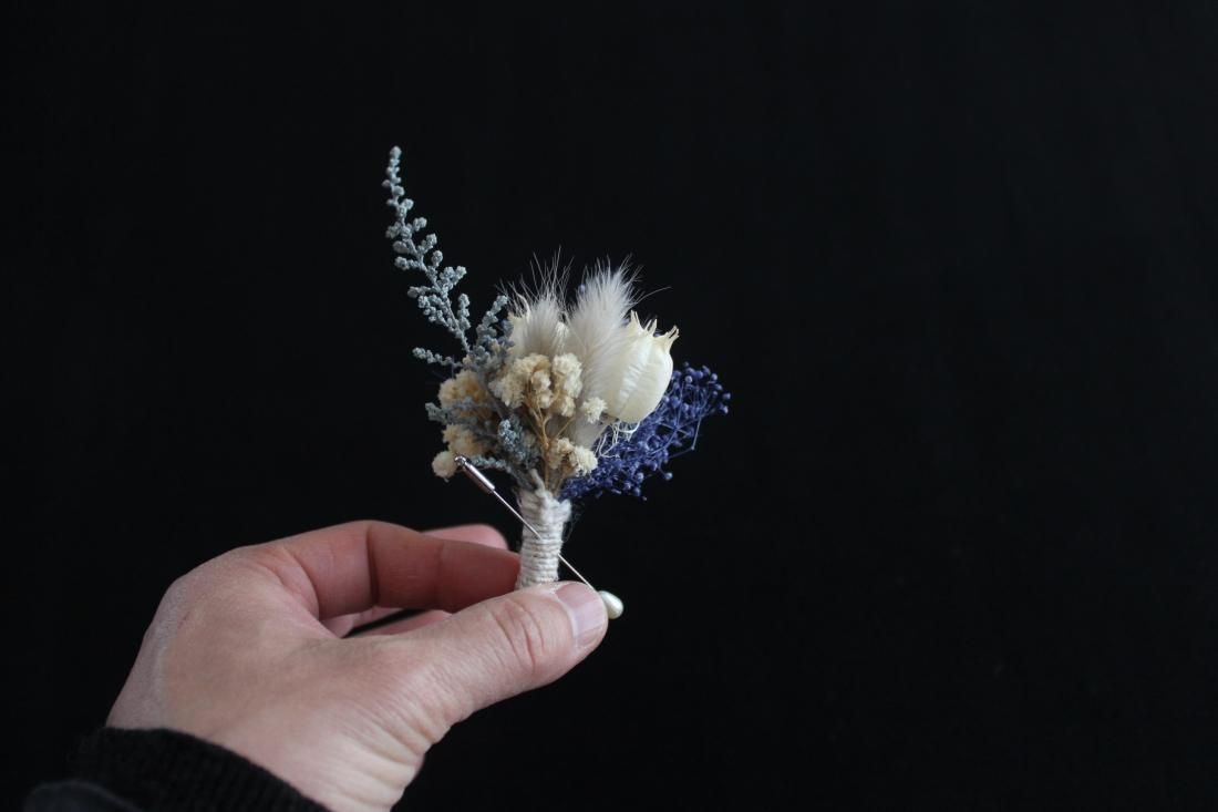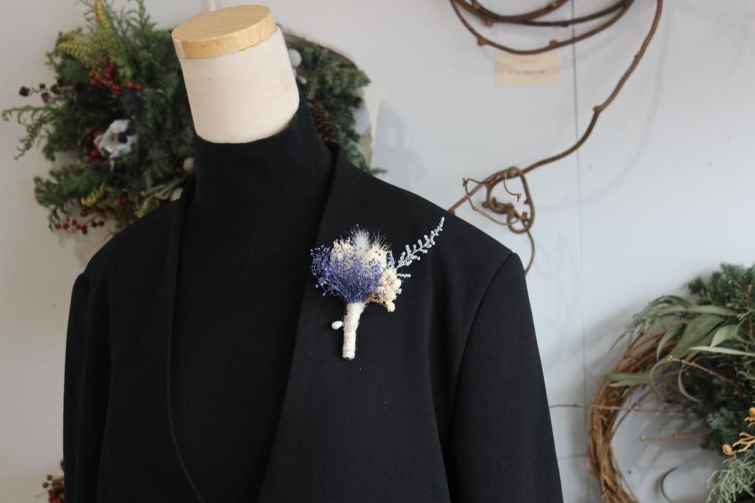 手のひらにおさまる大きさのコサージュです。プリザーブドフラワーでつくられた小さなブーケ、シックな色合いに大人の品を感じます。