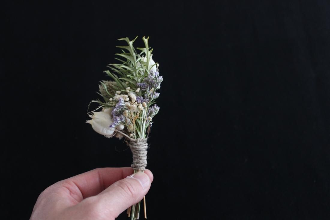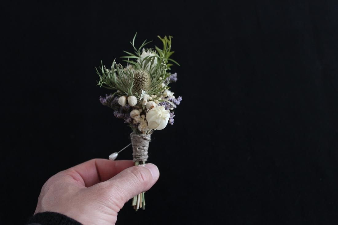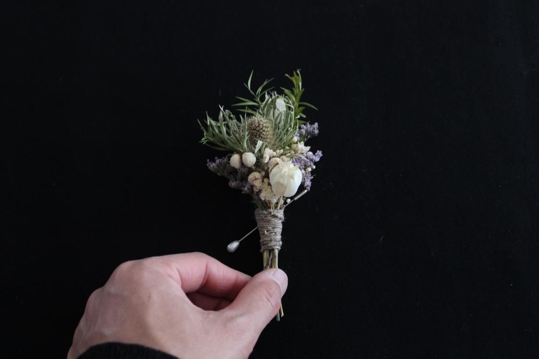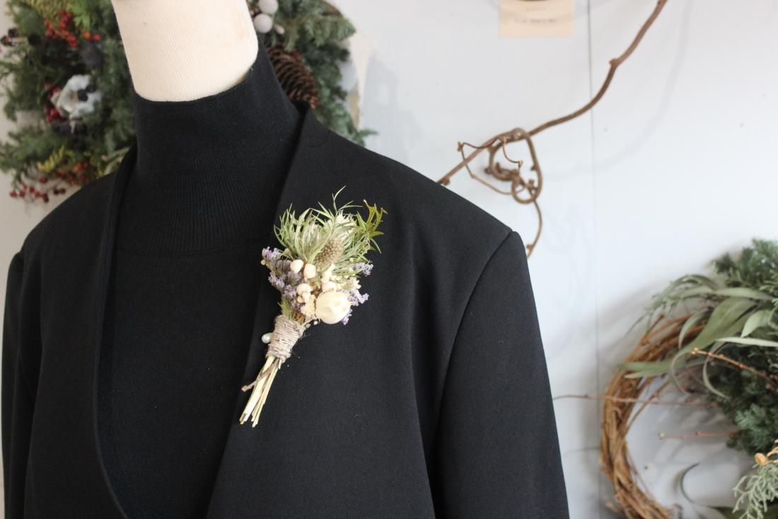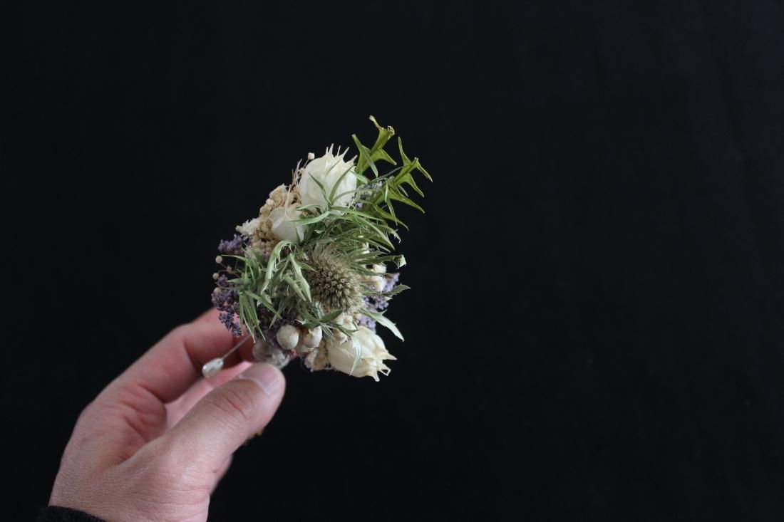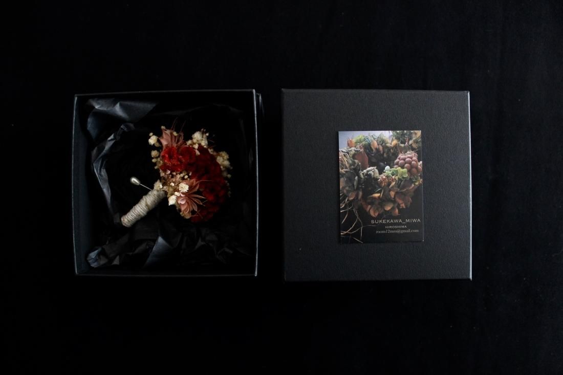 手のひらにおさまる大きさのコサージュです。プリザーブドフラワーでつくられた小さなブーケ、シックな色合いに大人の品を感じます。