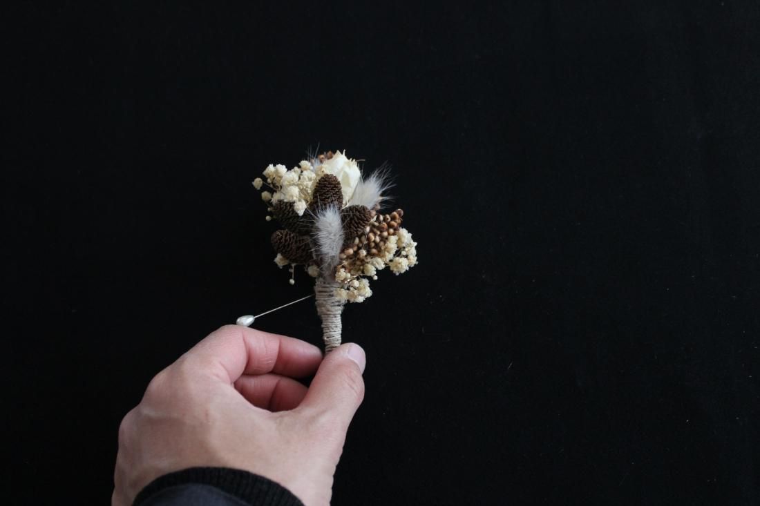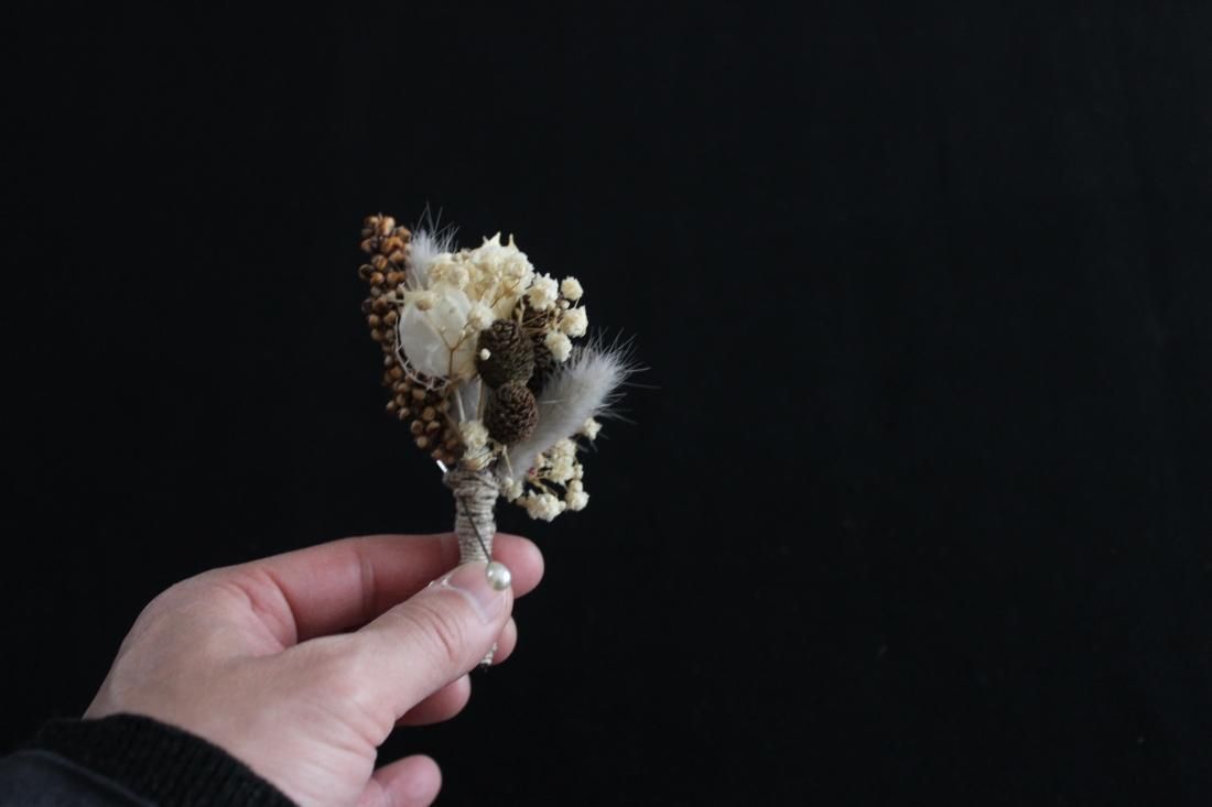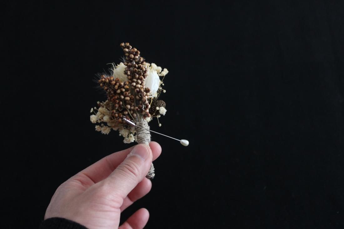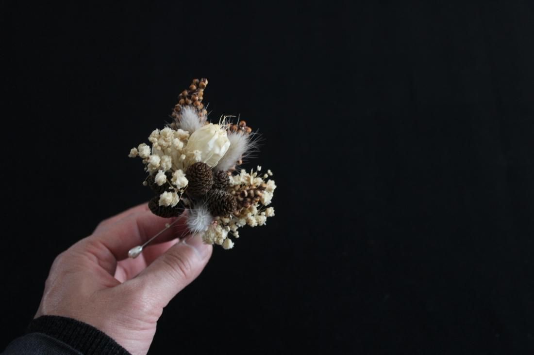 手のひらにおさまる大きさのコサージュです。プリザーブドフラワーでつくられた小さなブーケ、シックな色合いに大人の品を感じます。