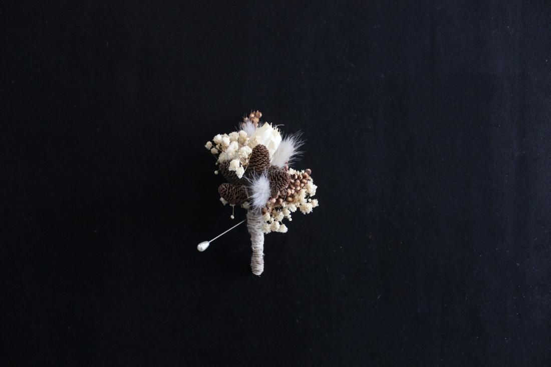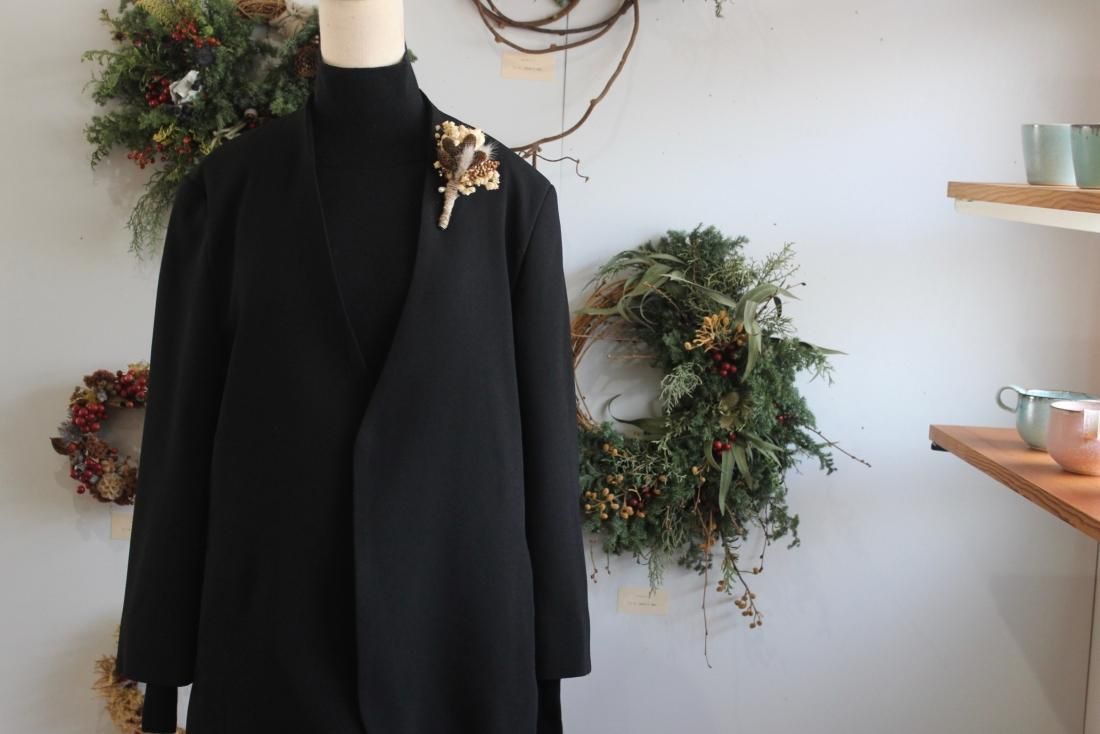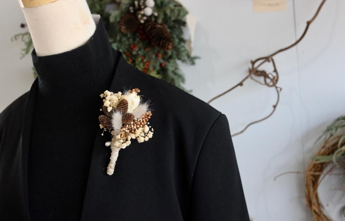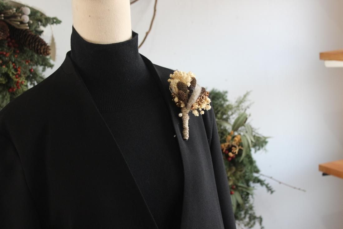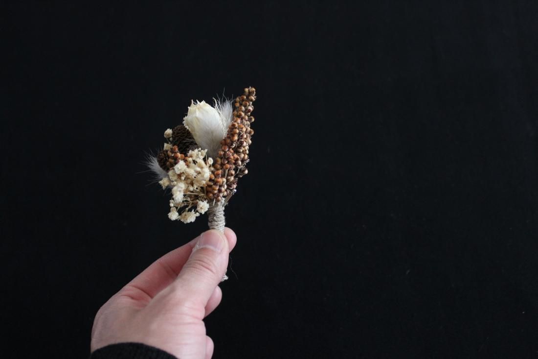 手のひらにおさまる大きさのコサージュです。プリザーブドフラワーでつくられた小さなブーケ、シックな色合いに大人の品を感じます。