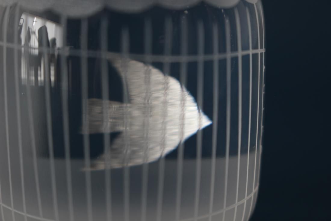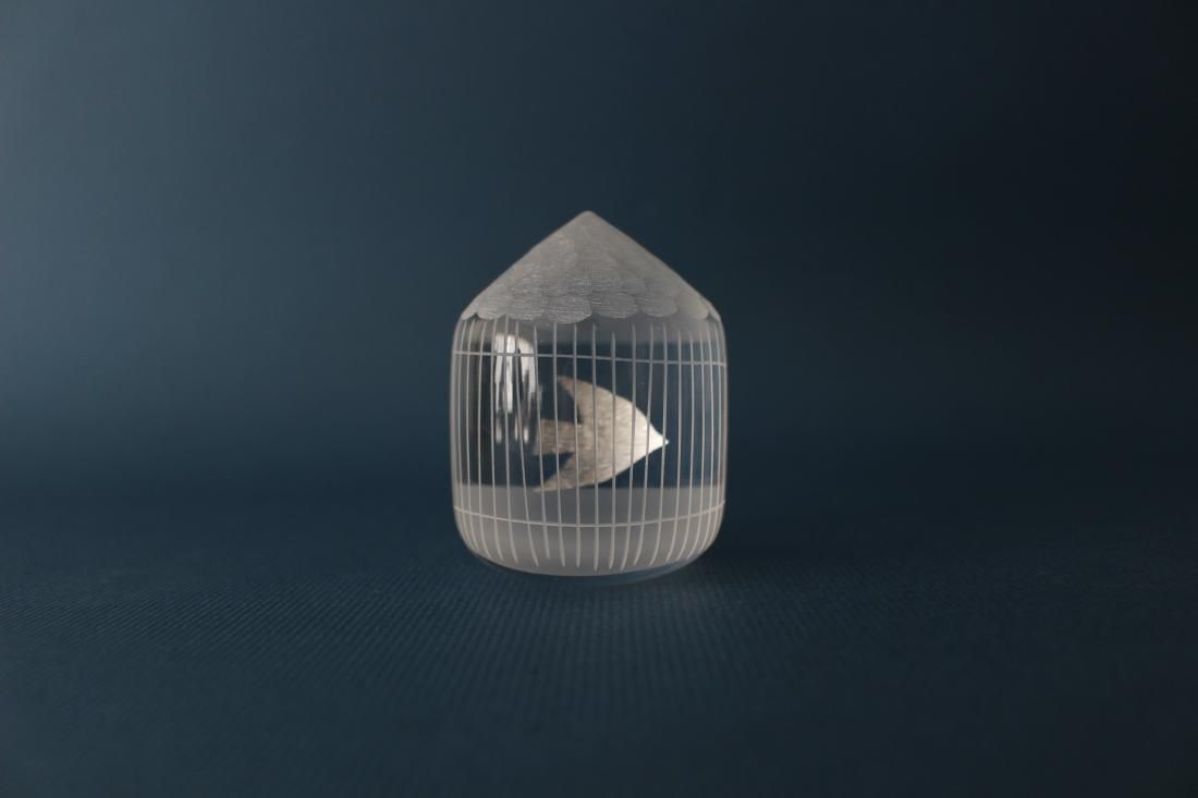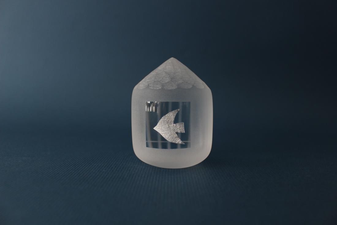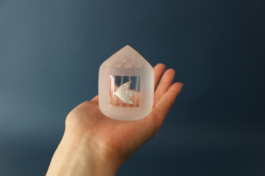 とんがり屋根がかわいらしいガラスの家に住むのは、銀箔で形づくられた一羽の鳥。