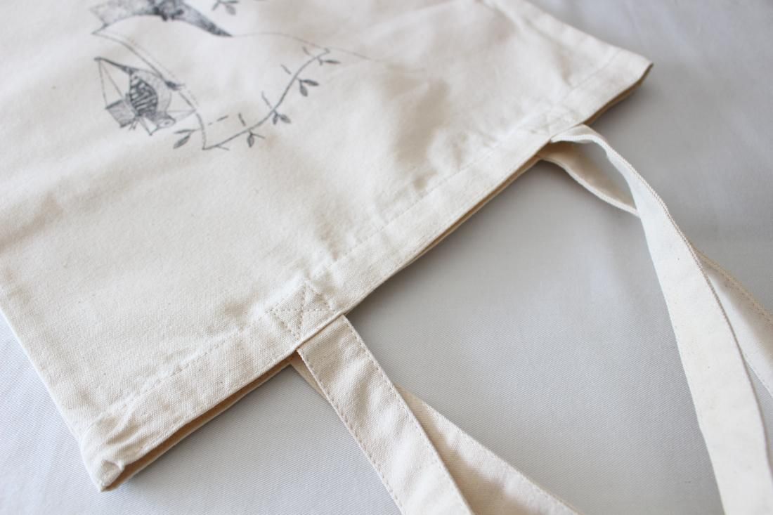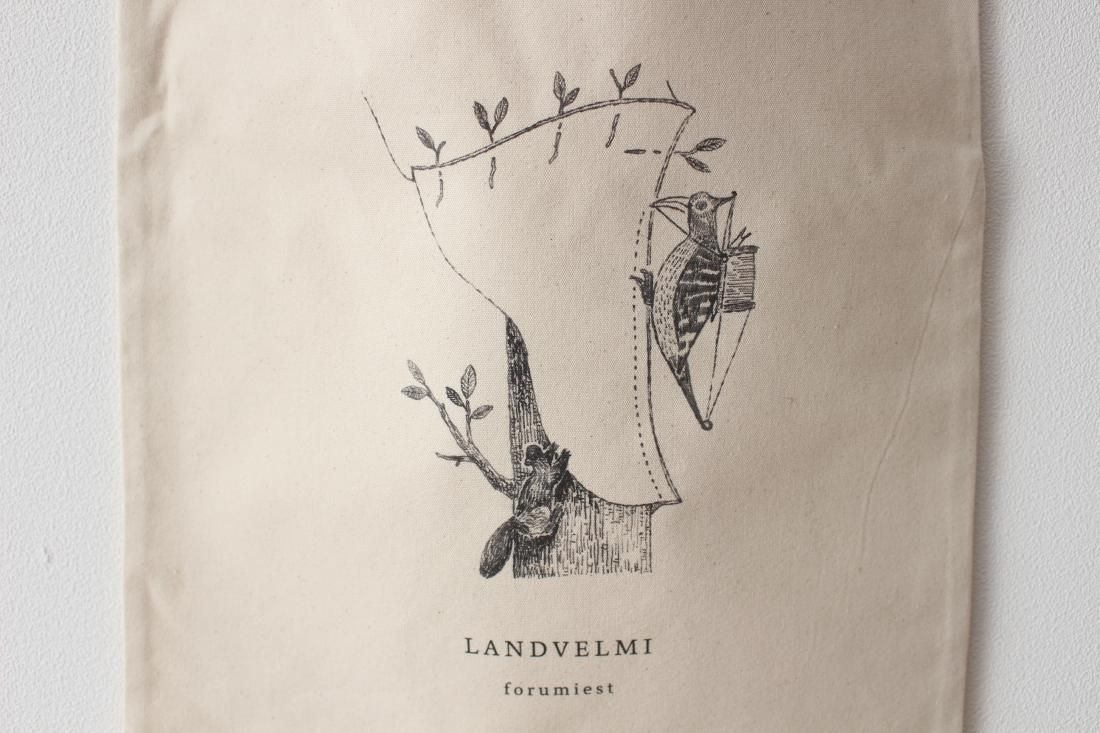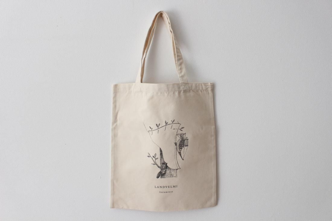 ハリのあるしっかりとした生地に、ランドベルミのキツツキのイラストがプリントされています。
