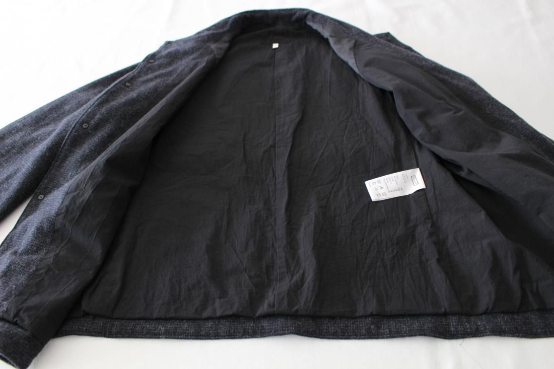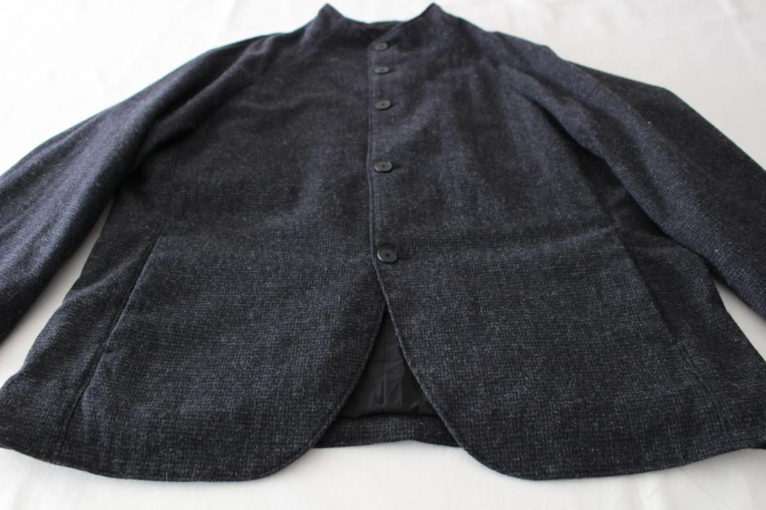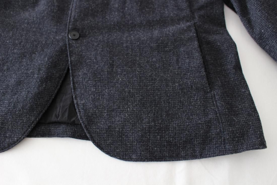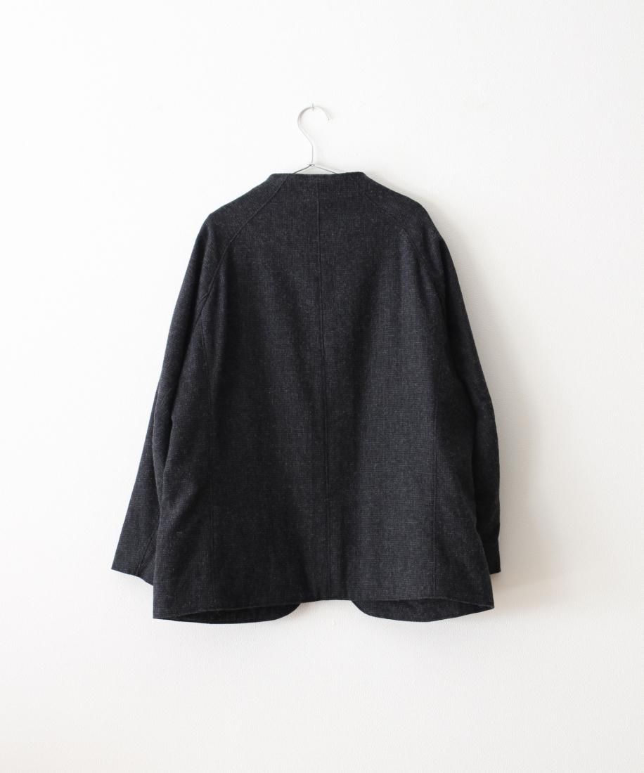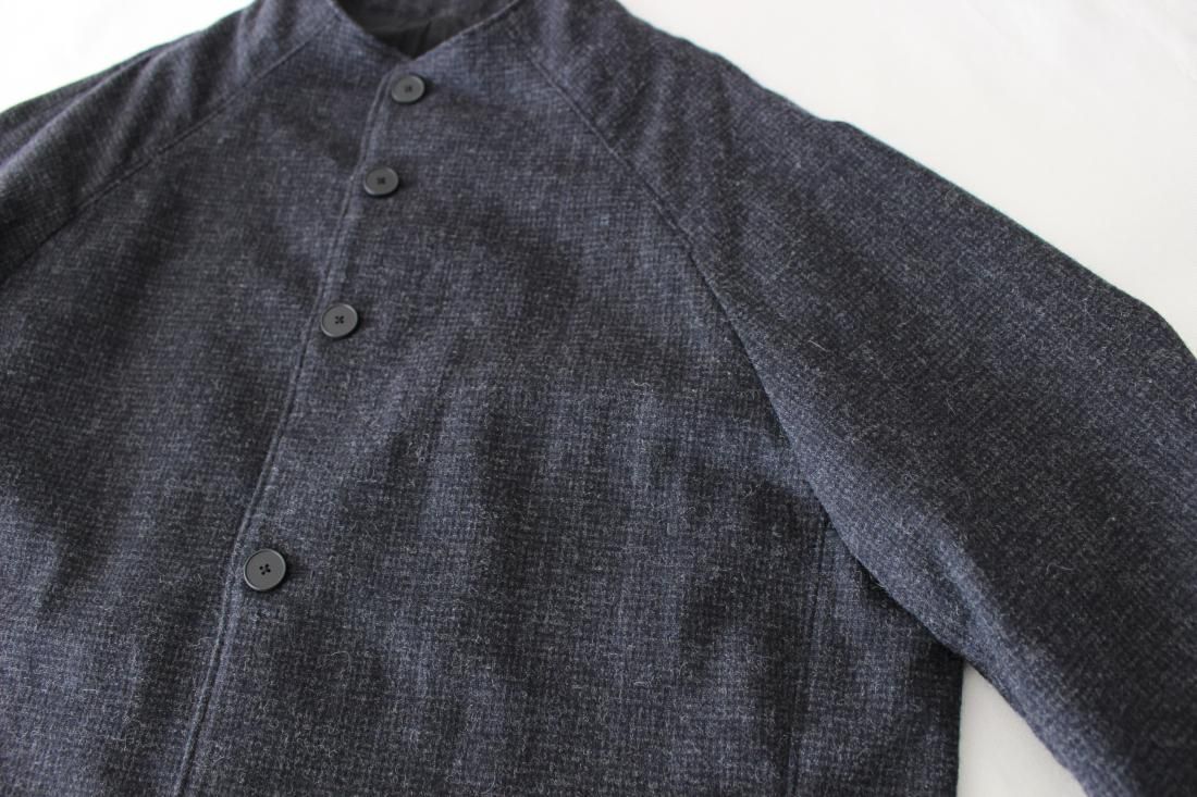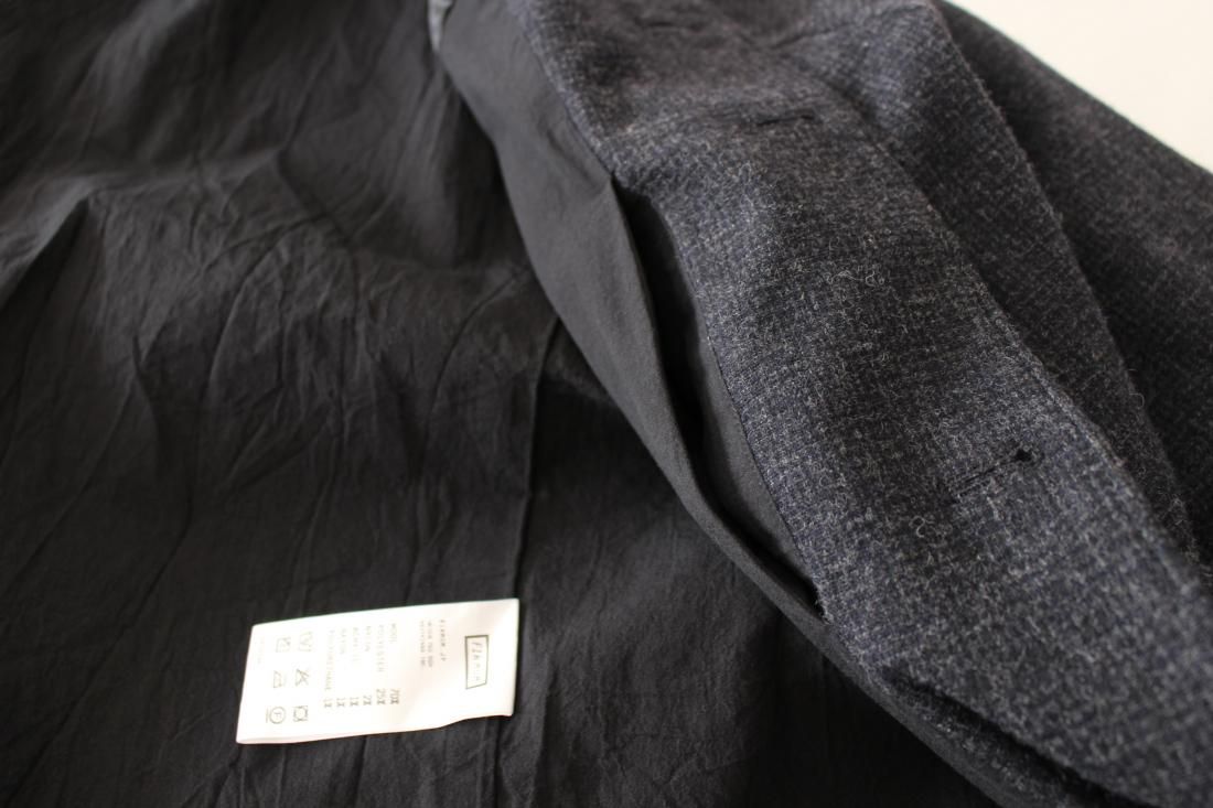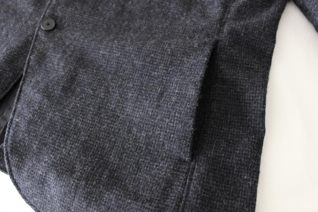 粗いざっくりとした古いウールの感じを出すために、反毛などを使用したウールの千鳥柄の平織生地。製品洗いとタンブラー乾燥をすることで揉み込み、ストレッチ性や風合いを出しています。素材の一部に反毛を使用いるため、生地に飛び込みやネップ等が見られます。ご了承ください。