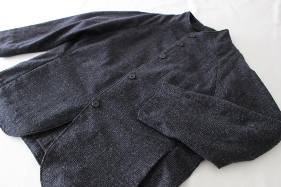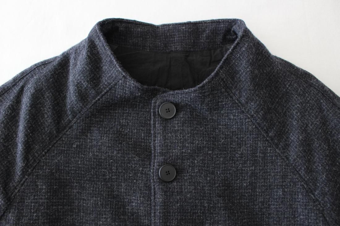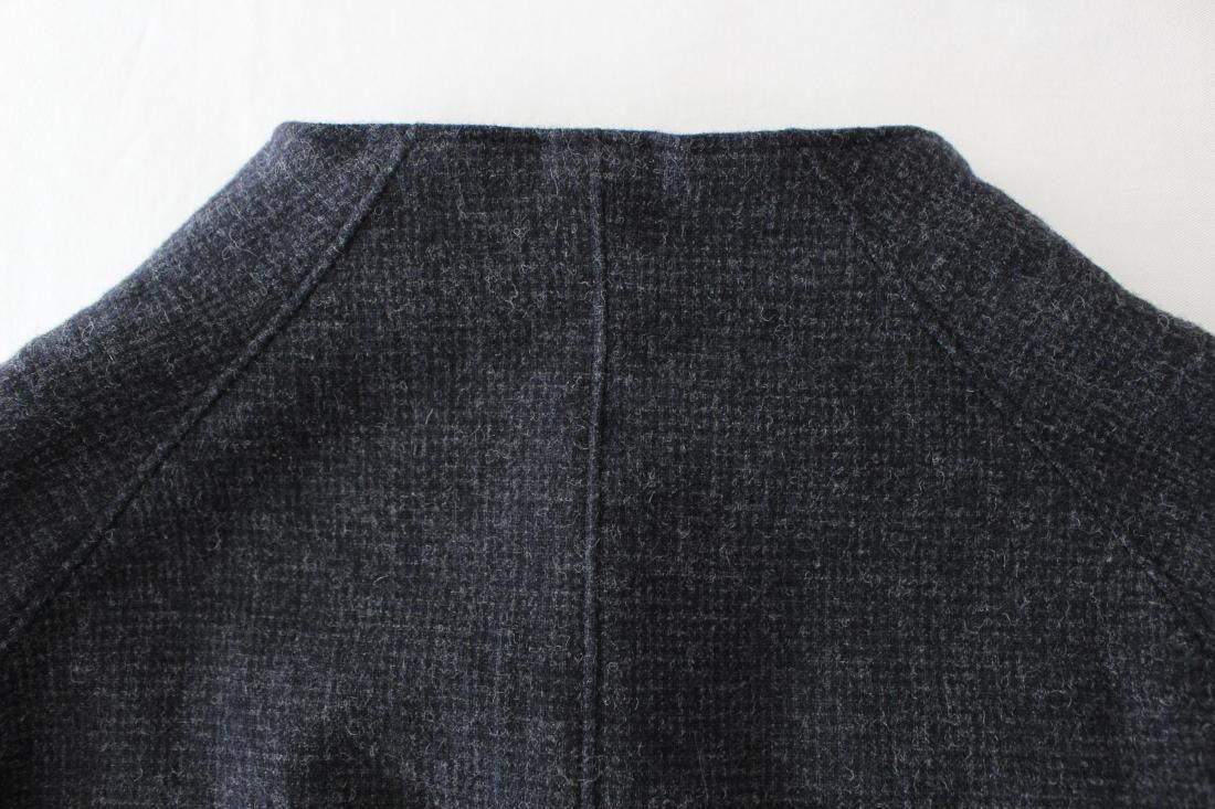 やや立ち上がったボトルネック、ラグラン仕立ての2枚袖、肩にはダーツが入っています。雰囲気のある上質な生地は、着れば着るほど馴染んできます。